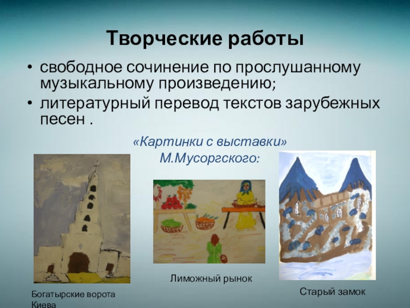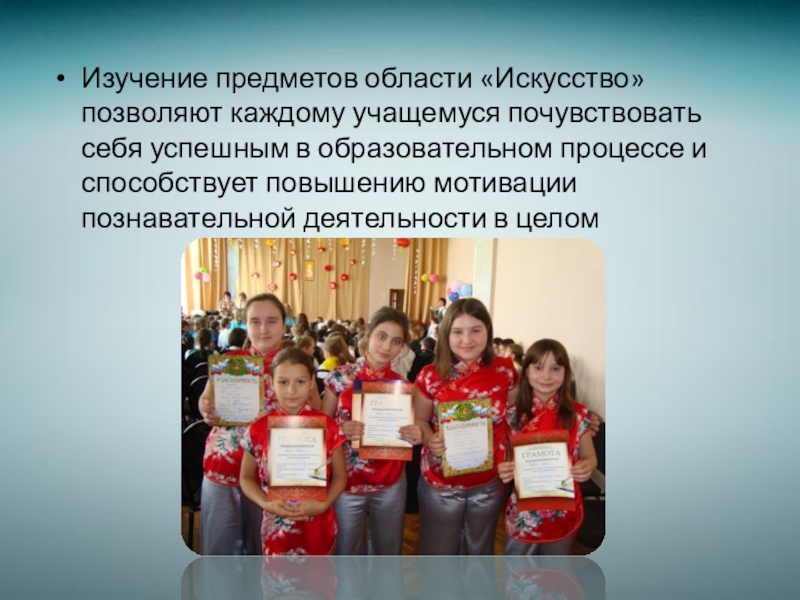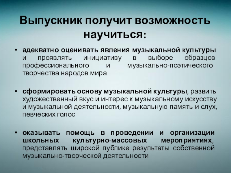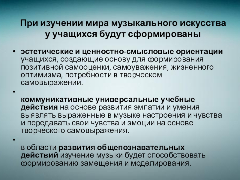 • воплощать музыкальные образы при создании театрализованных и музыкально-пластических композиций, исполнении вокально-хоровых произведений, в импровизации.