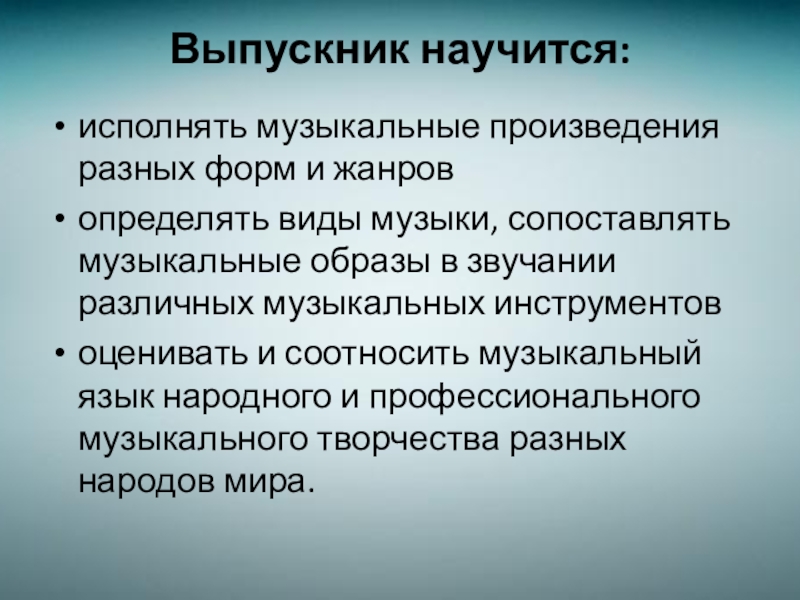 • оценивать и соотносить музыкальный язык народного и профессионального музыкального творчества разных народов мира.