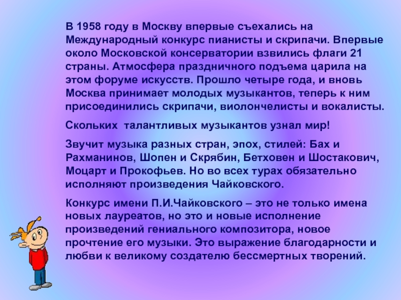 году в Москву впервые съехались на Международный конкурс пианисты и скрипачи. Впервые около Московской консерватории взвились флаги 21 страны. Атмосфера праздничного подъема царила на этом форуме искусств. Прошло четыре года, и вновь Москва принимает молодых музыкантов, теперь к ним присоединились скрипачи, виолончелисты и вокалисты.