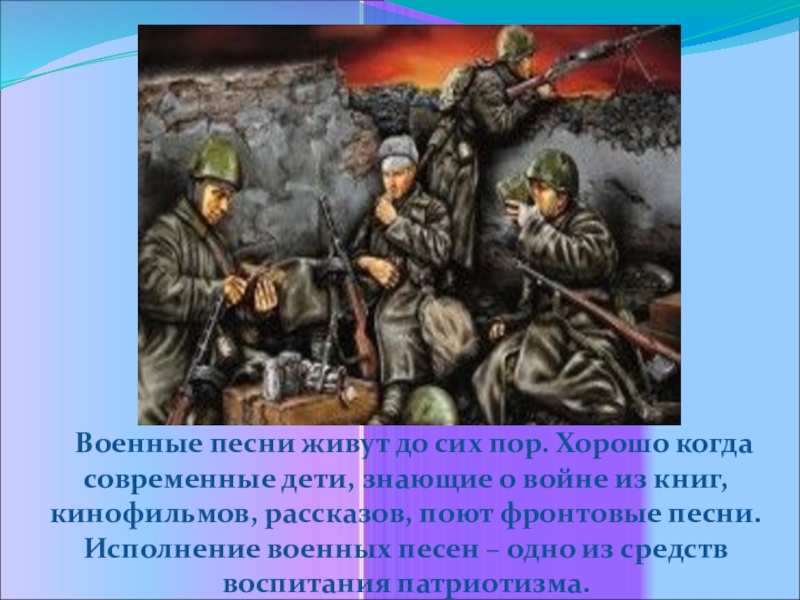 Слайд 16Военные песни живут до сих пор. Хорошо когда современные дети, знающие