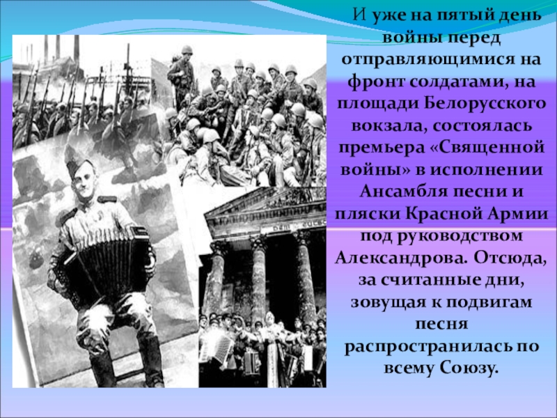 на площади Белорусского вокзала, состоялась премьера «Священной войны» в исполнении Ансамбля песни и пляски Красной Армии под руководством Александрова. Отсюда, за считанные дни, зовущая к подвигам песня распространилась по всему Союзу.