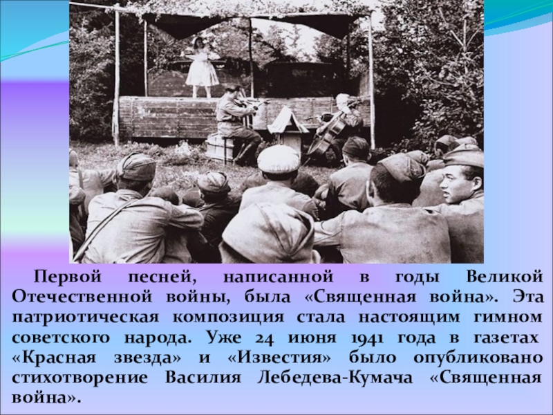 Слайд 5 Первой песней, написанной в годы Великой Отечественной войны, была «Священная война».