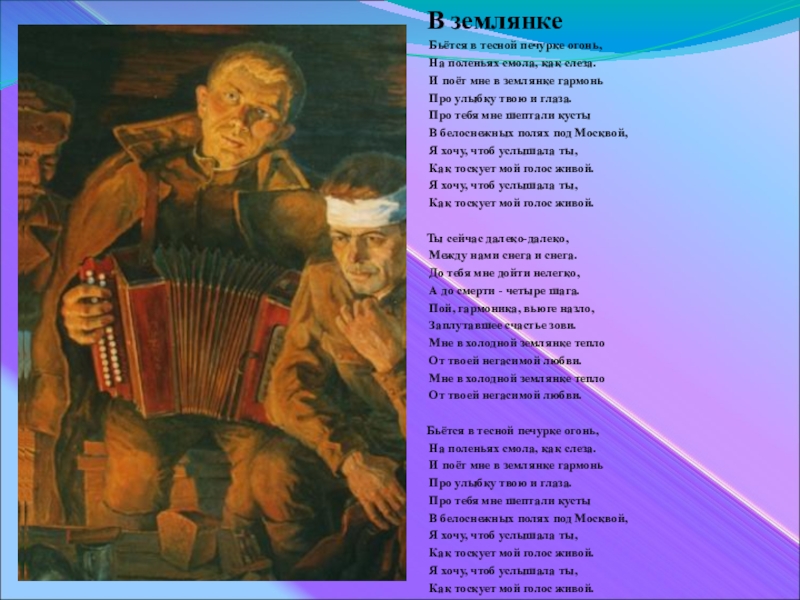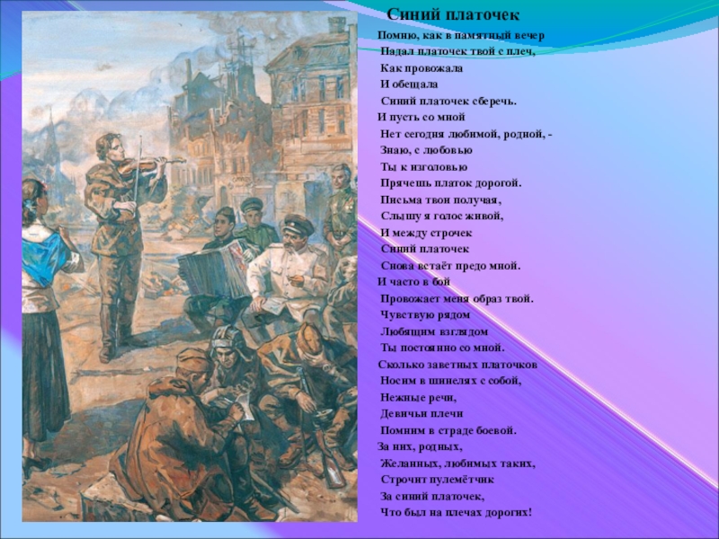 Они звучали буквально с первого и до последнего дня войны. Все 1418 дней и ночей войны песня шла вместе с народом трудным путем. Песни рождались на фронте и в тылу, поднимали бойцов в атаку, согревали сердце на привале, помогали выстоять, выжить и дождаться близких тем, кто оставался у станков и в поле.