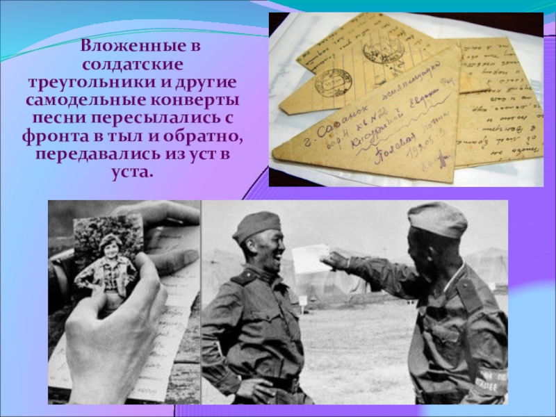 Слайд 4 Вложенные в солдатские треугольники и другие самодельные конверты песни пересылались