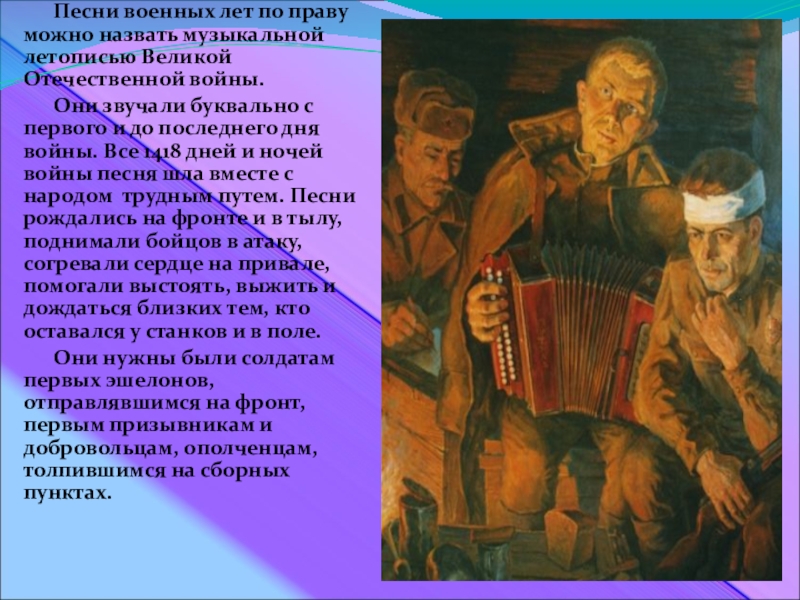 Слайд 2Песни военных лет по праву можно назвать музыкальной летописью Великой Отечественной