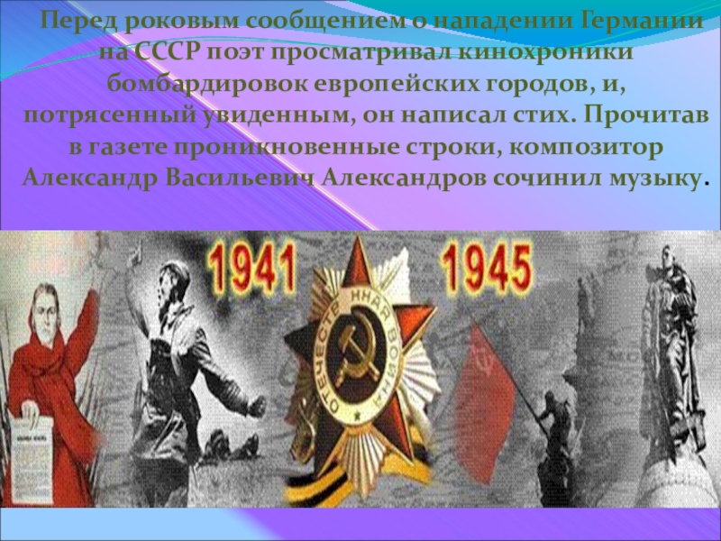 бомбардировок европейских городов, и, потрясенный увиденным, он написал стих. Прочитав в газете проникновенные строки, композитор Александр Васильевич Александров сочинил музыку.