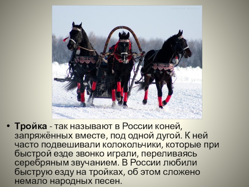 Слайд 6Тройка - так называют в России коней, запряжённых вместе, под одной