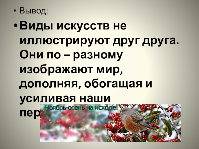 Виды искусств не иллюстрируют друг друга. Они по – разному изображают