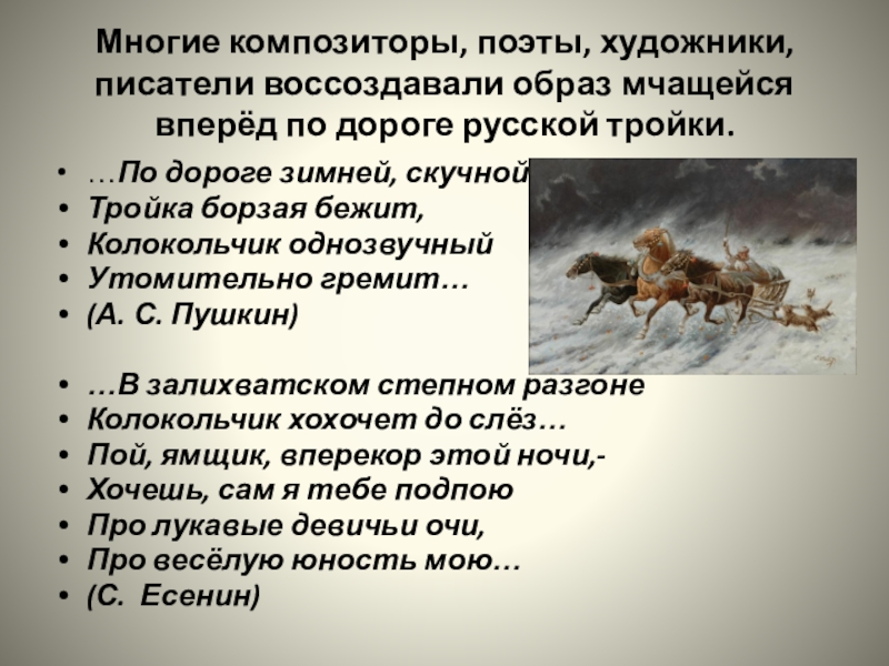 Слайд 13Многие композиторы, поэты, художники, писатели воссоздавали образ мчащейся вперёд по дороге