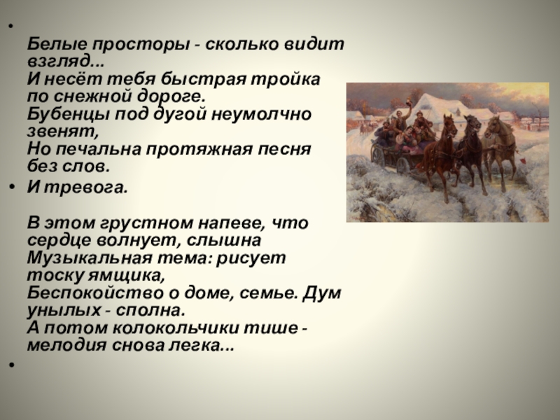 - в третьей части мы слышим звон бубенцов, всё дальше удаляющихся от нас, он как бы исчезает в дымке уходящего дня…