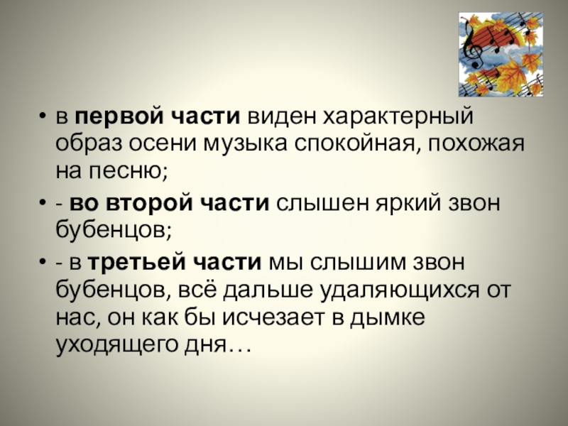 Слайд 10в первой части виден характерный образ осени музыка спокойная, похожая на