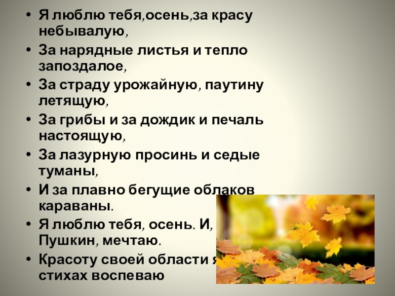 Слайд 3Я люблю тебя,осень,за красу небывалую,