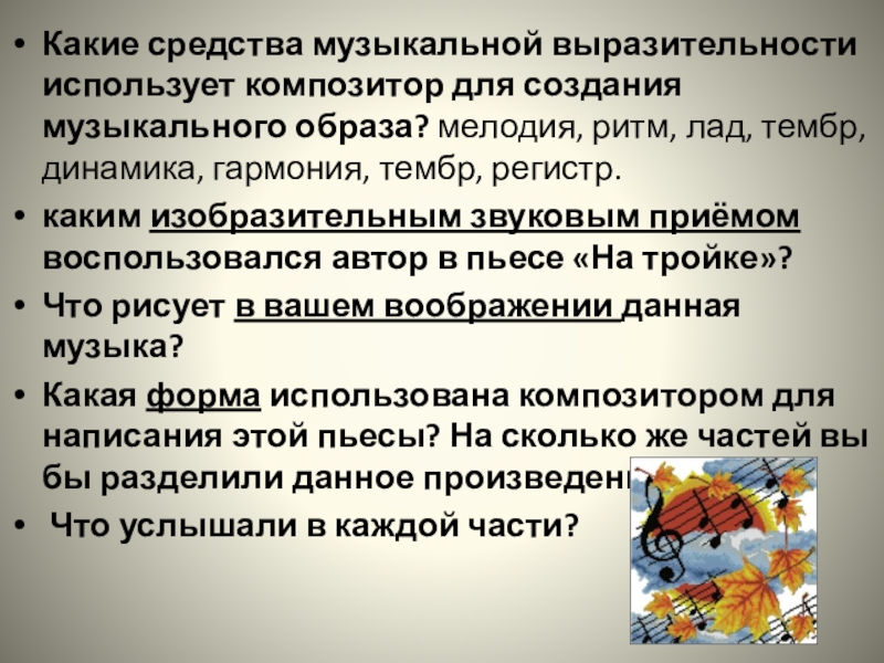 Слайд 9Какие средства музыкальной выразительности использует композитор для создания музыкального образа? мелодия,
