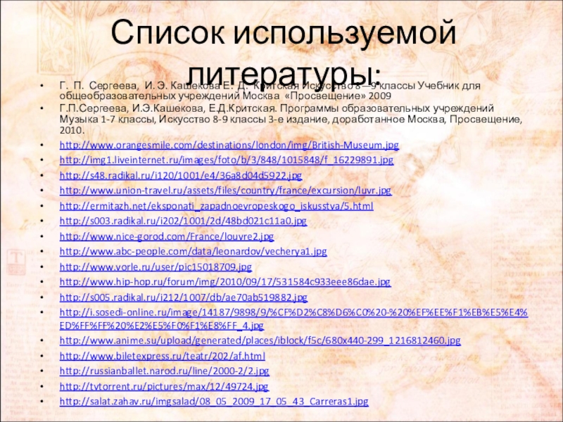 Список используемой литературы:Г. П. Сергеева, И. Э. Кашекова Е. Д. Критская Искусство 8—9 классы Учебник для общеобразовательных