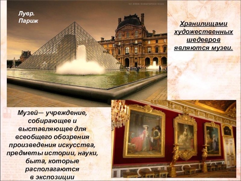 Музей— учреждение, собирающее и выставляющее для всеобщего обозрения произведения искусства,
