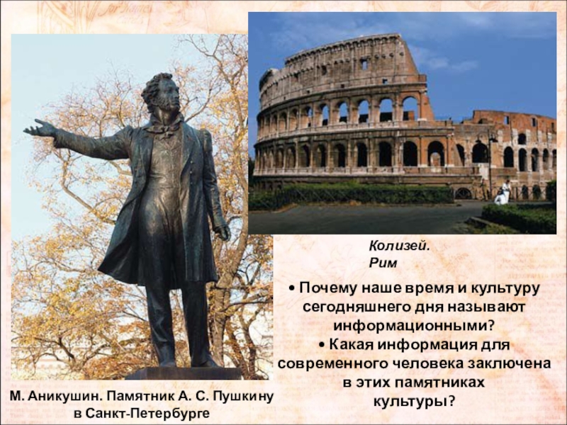 М. Аникушин. Памятник А. С. Пушкинув Санкт-ПетербургеКолизей. Рим• Почему наше время и культуру сегодняшнего дня называют информационными?•