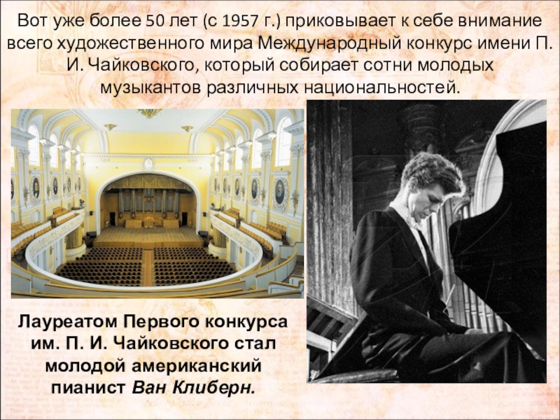 внимание всего художественного мира Международный конкурс имени П. И. Чайковского, который собирает сотни молодых музыкантов различных национальностей.