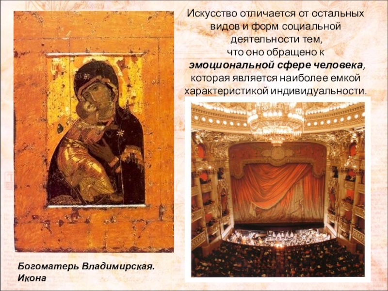 Искусство отличается от остальных видов и форм социальной деятельности тем, что оно обращено к эмоциональной сфере человека, которая является наиболее емкой характеристикой индивидуальности.Богоматерь Владимирская. Икона