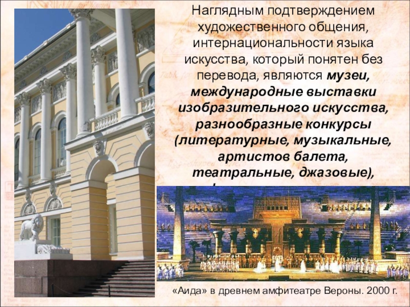 Наглядным подтверждением художественного общения, интернациональности языка искусства, который понятен без перевода, являются музеи, международные выставки изобразительного искусства,