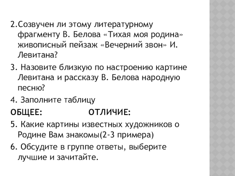 3. Назовите близкую по настроению картине Левитана и рассказу В. Белова народную песню?