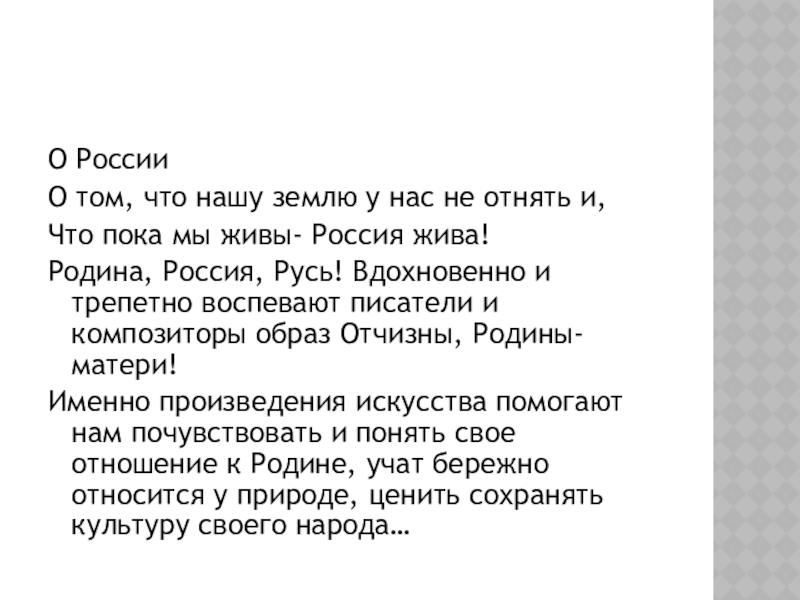 Именно произведения искусства помогают нам почувствовать и понять свое отношение к Родине, учат бережно относится у природе, ценить сохранять культуру своего народа…