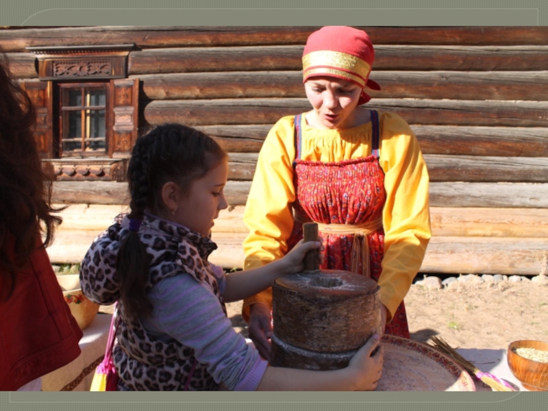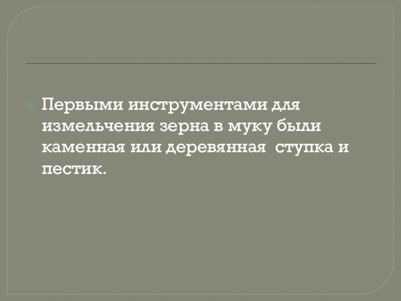 Слайд 3Первыми инструментами для измельчения зерна в муку были каменная или деревянная