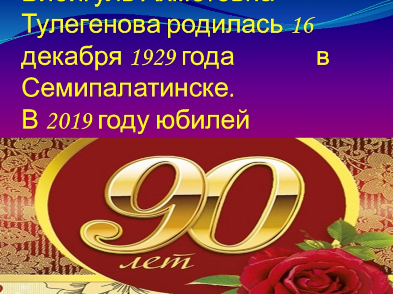 Слайд 2Бибигуль Ахметовна Тулегенова родилась 16 декабря 1929 года