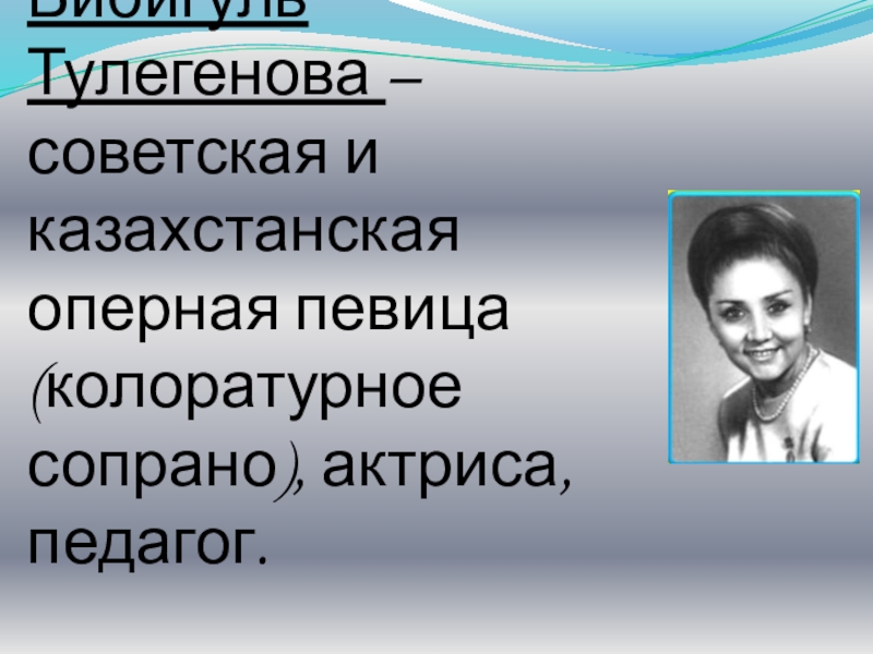 Слайд 3 Бибигуль Тулегенова – советская и казахстанская оперная певица (колоратурное сопрано), актриса,