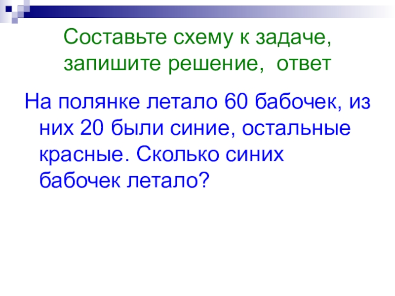 Составьте схему к задаче, запишите решение, ответНа полянке летало 60 бабочек, из них 20 были синие, остальные