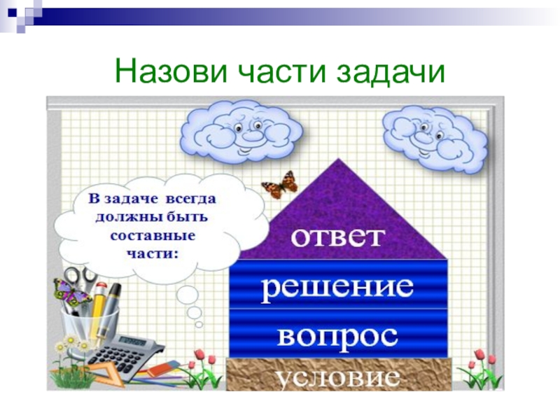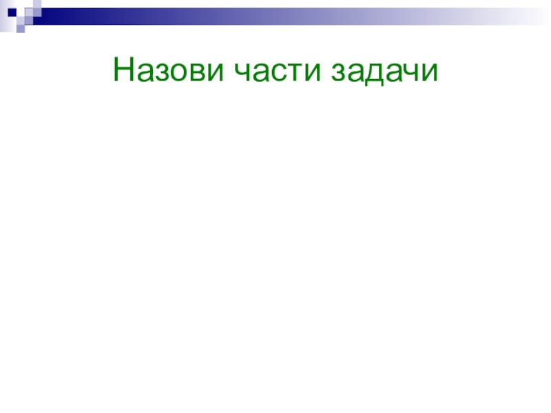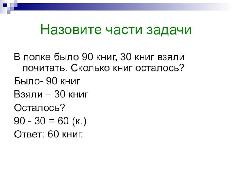 Назовите части задачиВ полке было 90 книг, 30 книг взяли почитать. Сколько книг осталось?Было- 90 книгВзяли –