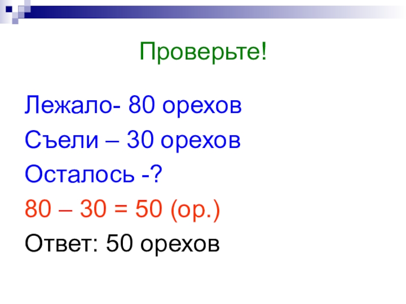 Проверьте!Лежало- 80 ореховСъели – 30 ореховОсталось -?80 – 30 = 50 (ор.)Ответ: 50 орехов