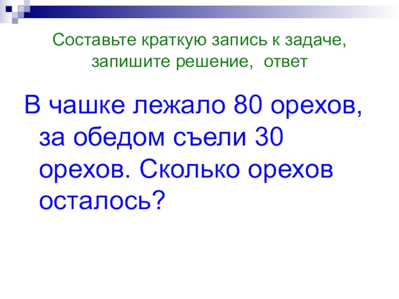 Составьте краткую запись к задаче, запишите решение, ответВ чашке лежало 80 орехов, за обедом съели 30 орехов.