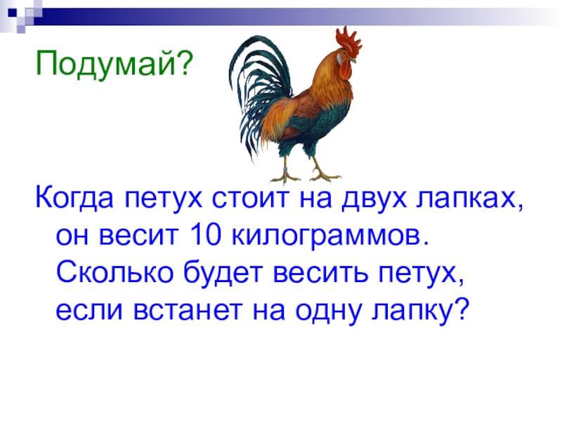 Подумай?Когда петух стоит на двух лапках, он весит 10 килограммов. Сколько будет весить петух, если встанет на