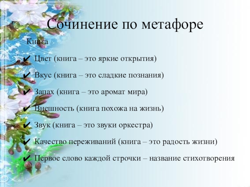 Сочинение по метафоре Книга Цвет (книга – это яркие открытия) Вкус (книга – это сладкие познания)Запах (книга