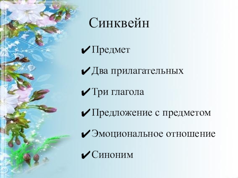 Синквейн ПредметДва прилагательныхТри глаголаПредложение с предметомЭмоциональное отношениеСиноним