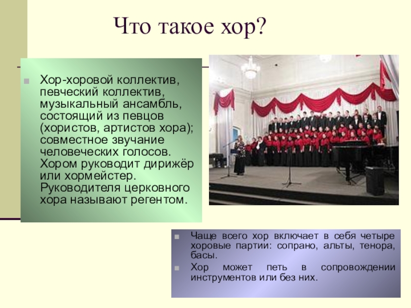 Хор может петь в сопровождении инструментов или без них.