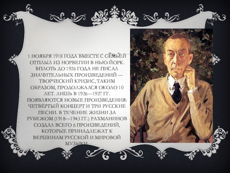 Нью-Йорк. Вплоть до 1926 года не писал значительных произведений — творческий кризис, таким образом, продолжался около 10 лет. Лишь в 1926—1927 гг. появляются новые произведения: Четвёртый концерт и Три русские песни. В течение жизни за рубежом (1918—1943 гг.) Рахманинов создал всего 6 произведений, которые принадлежат к вершинам русской и мировой музыки.