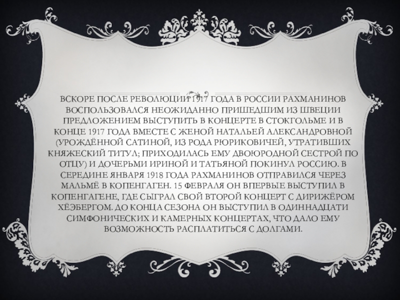 из Швеции предложением выступить в концерте в Стокгольме и в конце 1917 года вместе с женой Натальей Александровной (урождённой Сатиной, из рода Рюриковичей, утративших княжеский титул; приходилась ему двоюродной сестрой по отцу) и дочерьми Ириной и Татьяной покинул Россию. В середине января 1918 года Рахманинов отправился через Мальмё в Копенгаген. 15 февраля он впервые выступил в Копенгагене, где сыграл свой Второй концерт с дирижёром Хёэбергом. До конца сезона он выступил в одиннадцати симфонических и камерных концертах, что дало ему возможность расплатиться с долгами.