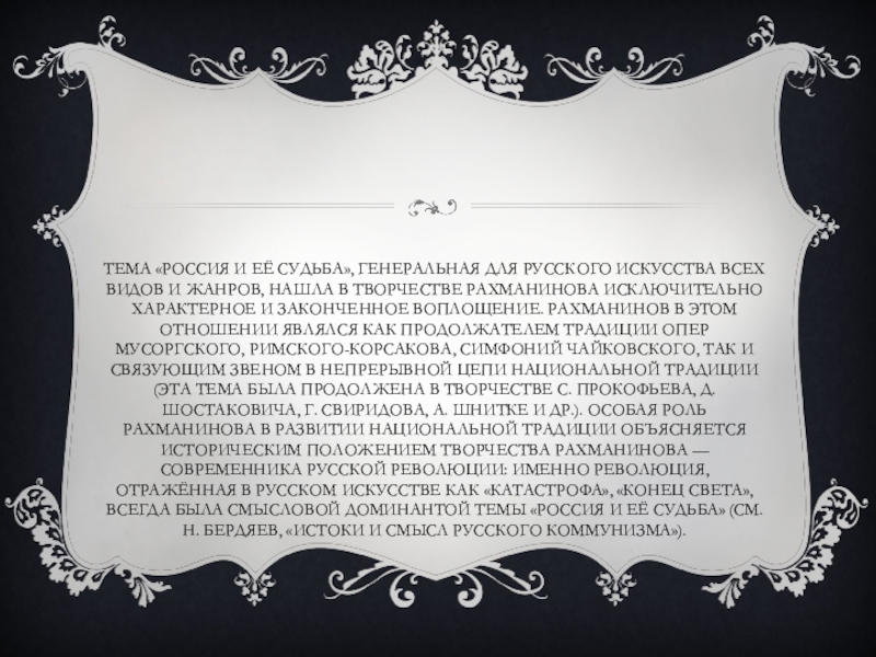 и жанров, нашла в творчестве Рахманинова исключительно характерное и законченное воплощение. Рахманинов в этом отношении являлся как продолжателем традиции опер Мусоргского, Римского-Корсакова, симфоний Чайковского, так и связующим звеном в непрерывной цепи национальной традиции (эта тема была продолжена в творчестве С. Прокофьева, Д. Шостаковича, Г. Свиридова, А. Шнитке и др.). Особая роль Рахманинова в развитии национальной традиции объясняется историческим положением творчества Рахманинова — современника русской революции: именно революция, отражённая в русском искусстве как «катастрофа», «конец света», всегда была смысловой доминантой темы «Россия и её судьба» (см. Н. Бердяев, «Истоки и смысл русского коммунизма»).