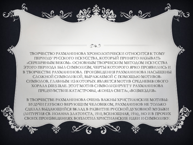 Слайд 16Творчество Рахманинова хронологически относится к тому периоду русского искусства, который принято