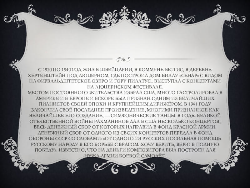 Слайд 12С 1930 по 1940 год жил в Швейцарии, в коммуне Веггис,