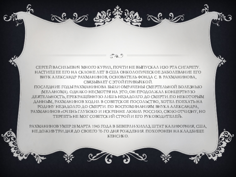 его на склоне лет в США онкологическое заболевание его внук Александр Рахманинов, основатель Фонда С. В. Рахманинова, связывает с этой привычкой.
