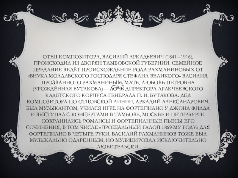 Слайд 4Отец композитора, Василий Аркадьевич (1841―1916), происходил из дворян Тамбовской губернии. Семейное