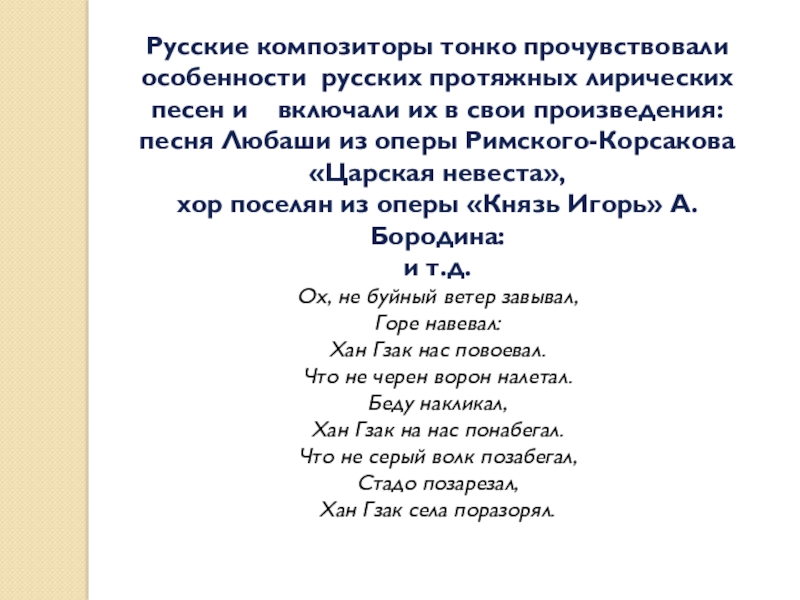Слайд 20Русские композиторы тонко прочувствовали особенности русских протяжных лирических песен и