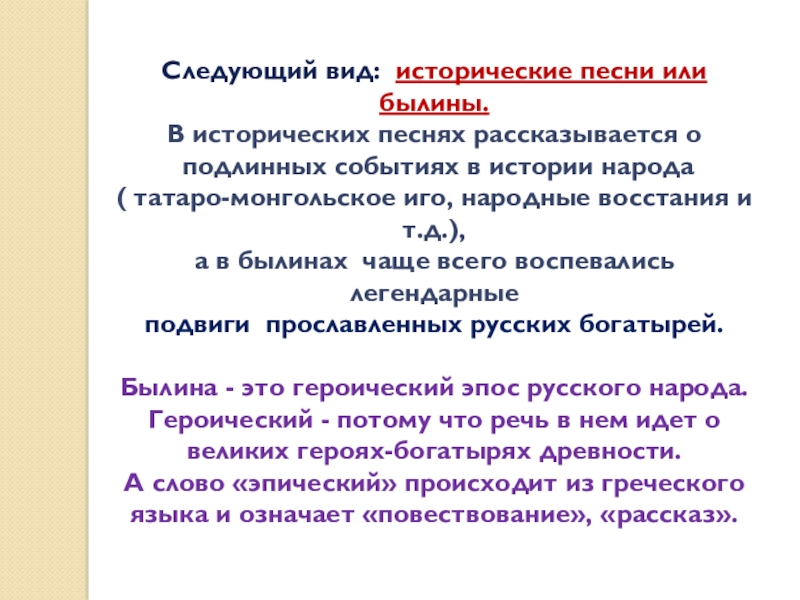 Слайд 17Следующий вид: исторические песни или былины.