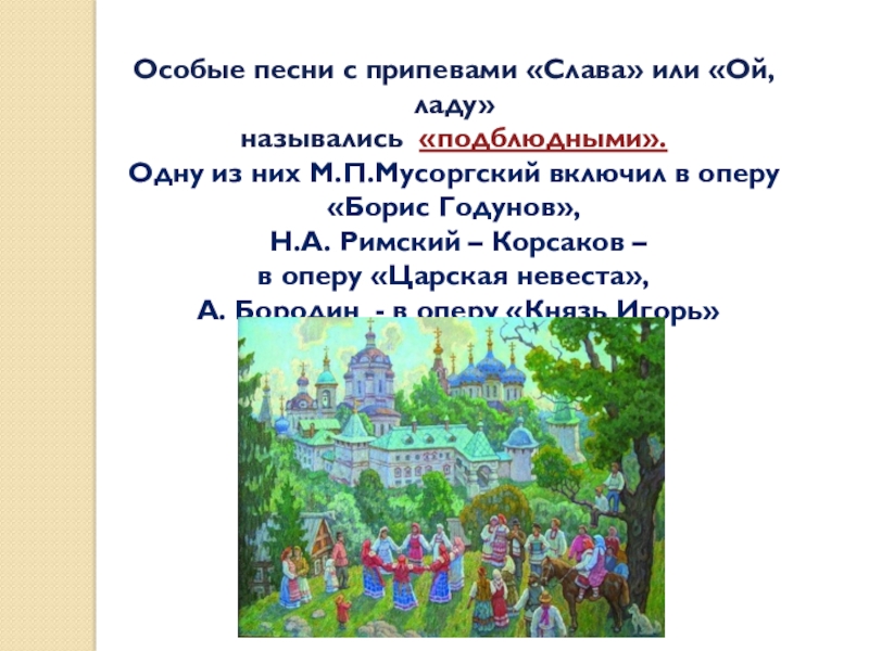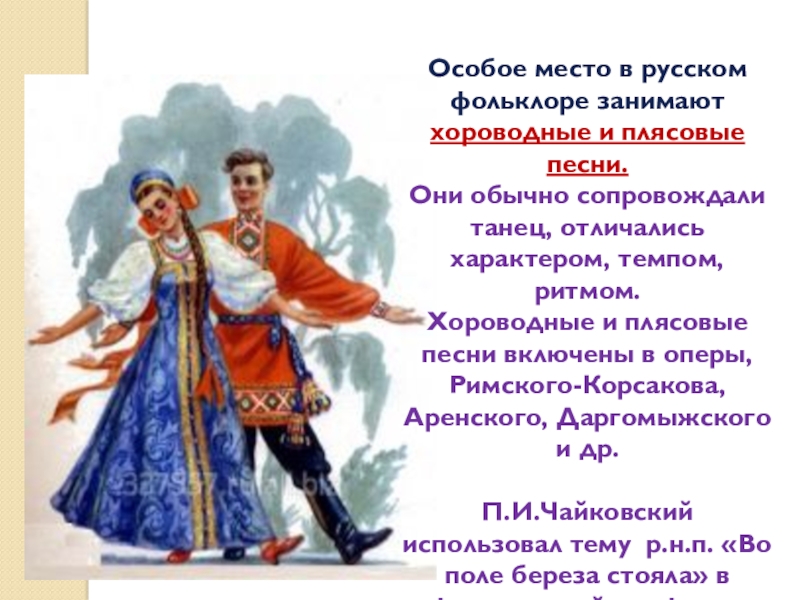 Хороводные и плясовые песни включены в оперы, Римского-Корсакова, Аренского, Даргомыжского и др.
