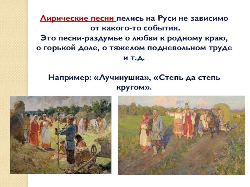 Слайд 19Лирические песни пелись на Руси не зависимо