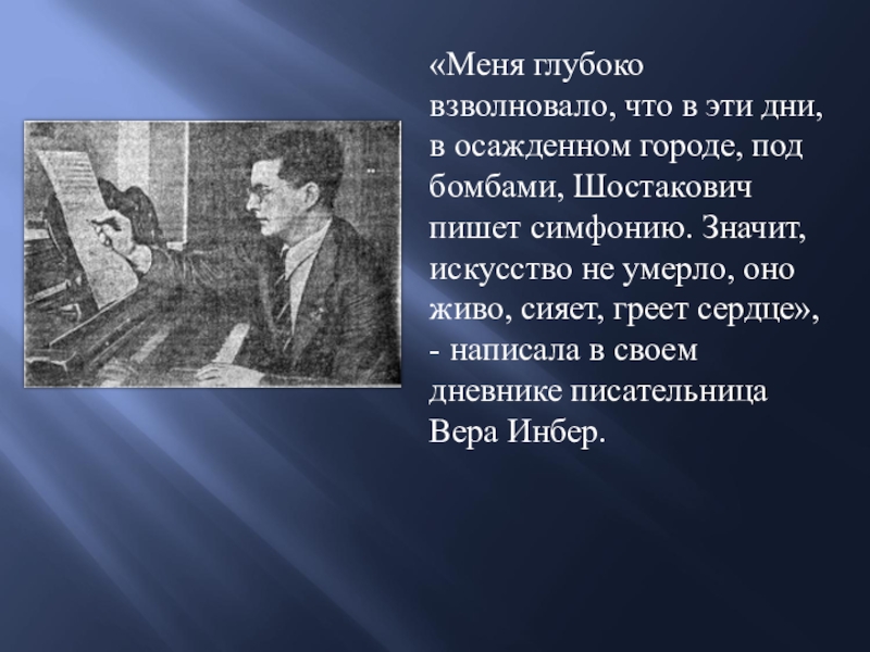 бомбами, Шостакович пишет симфонию. Значит, искусство не умерло, оно живо, сияет, греет сердце», - написала в своем дневнике писательница Вера Инбер.