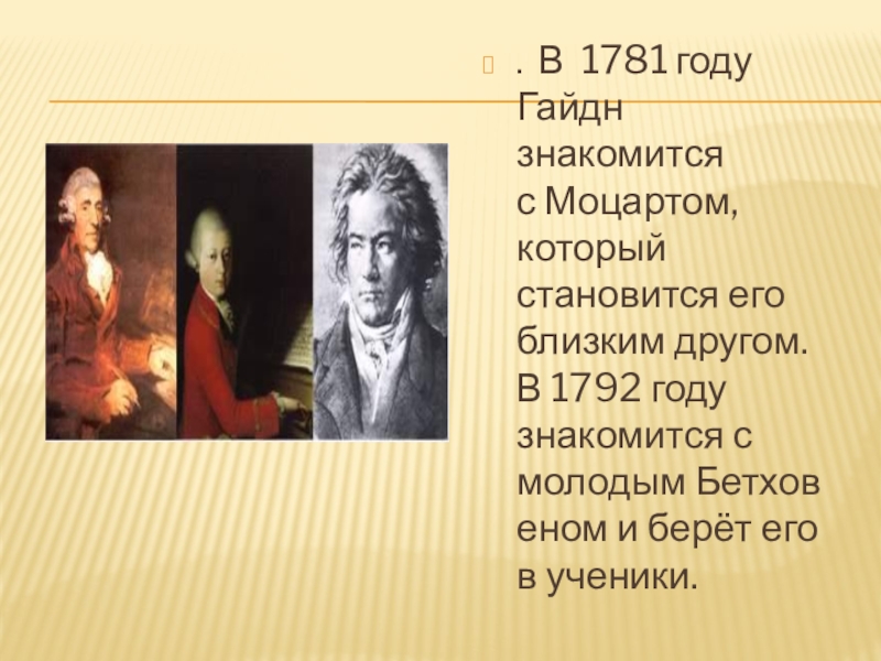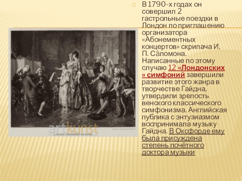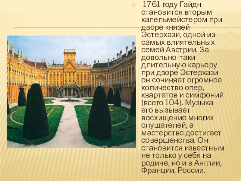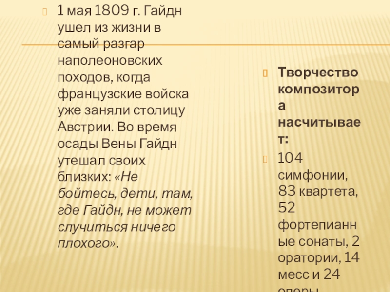104 симфонии, 83 квартета, 52 фортепианные сонаты, 2 оратории, 14 месс и 24 оперы.
