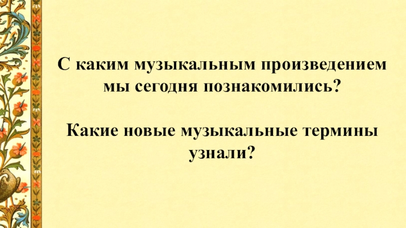 С каким музыкальным произведением мы сегодня познакомились? Какие новые музыкальные термины узнали?